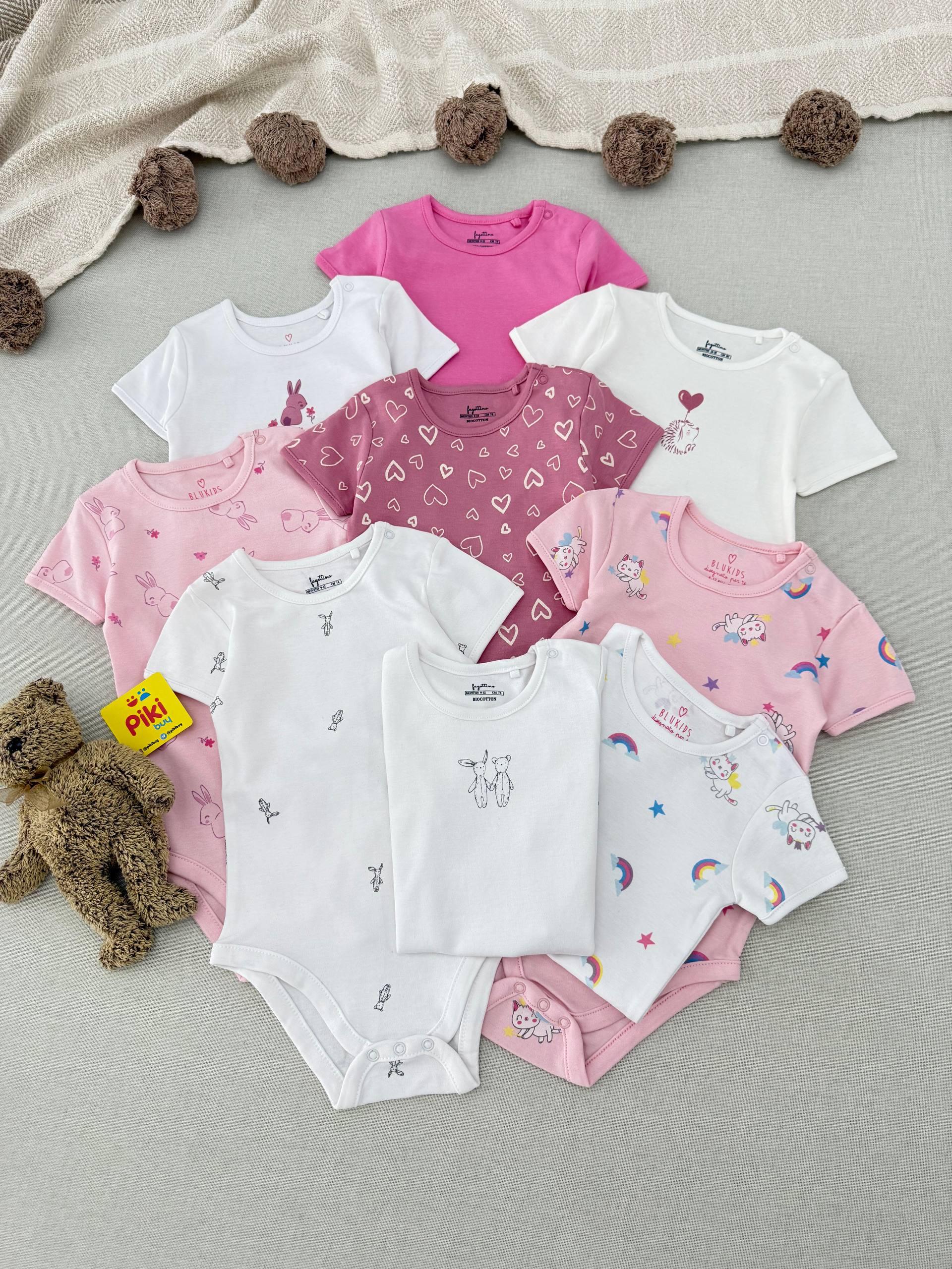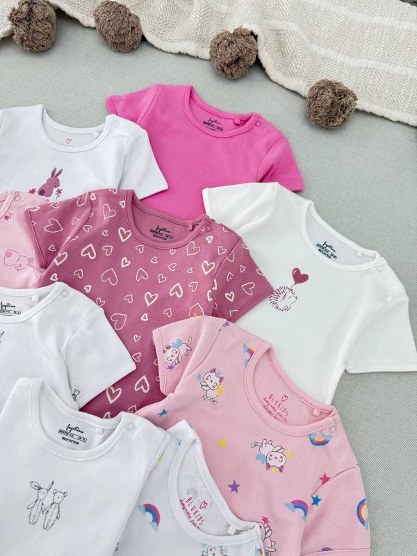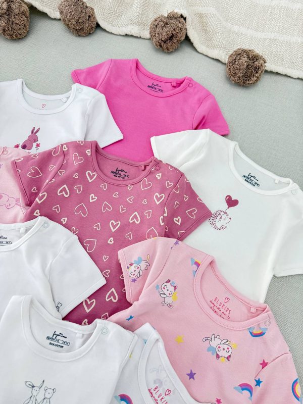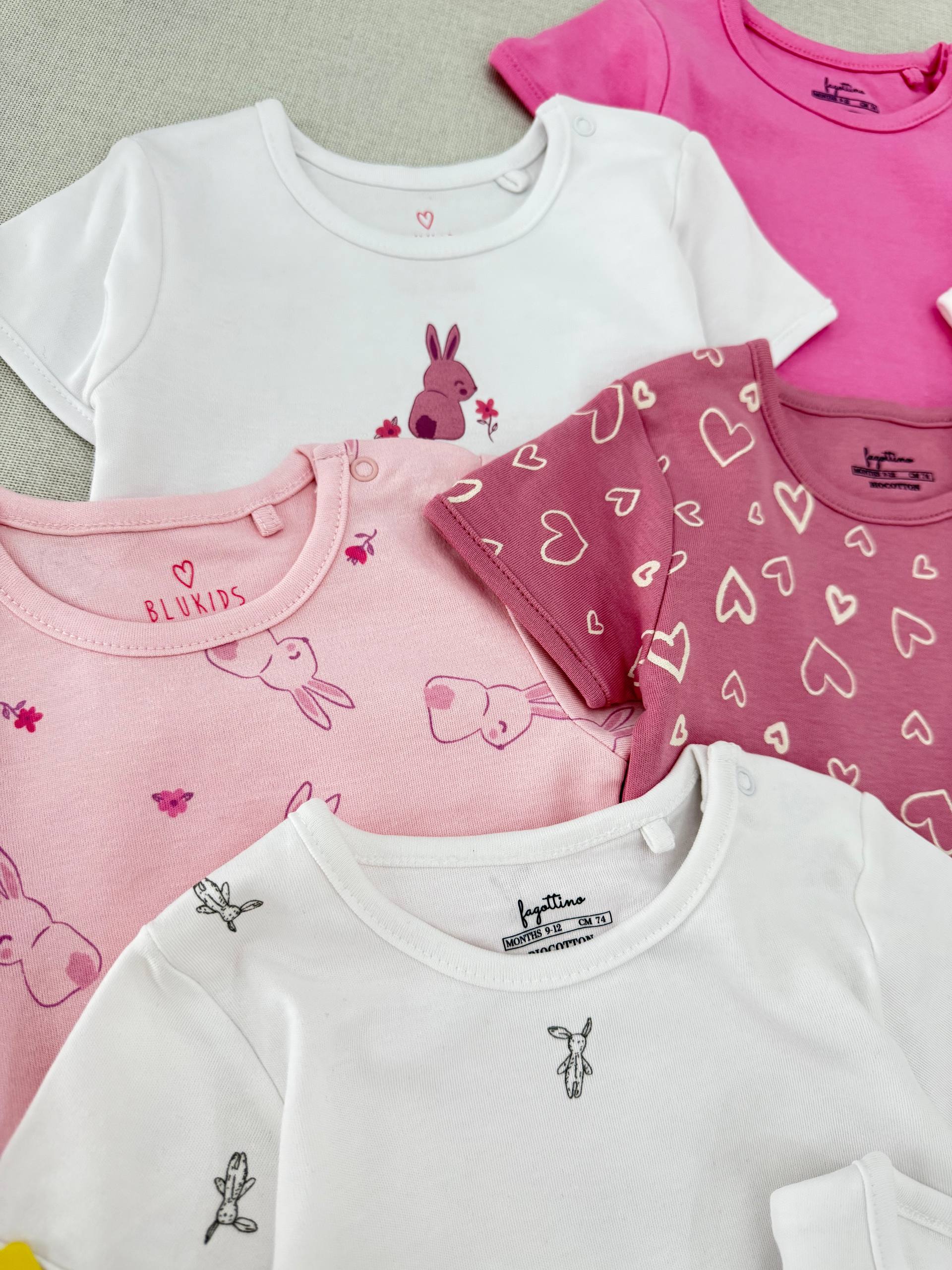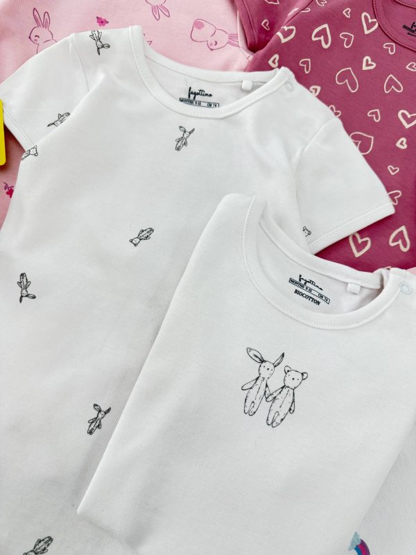 سرخابی ساده ", " طرحدار طرح خرگوش ", " سفید ساده با عکس خرگوش صورتی روی سینه ", " طرحدار رنگین کمان زمینه سفید ", " طرحدار رنگین کمان زمینه صورتی ", " زمینه سفیدبا خرگوش های ریز ", " سفید ساده با عکس دو تا خرگوش کوپولو روی سینه ", " زمینه شیری طرح جوجه تیغی ", " زمینه کالباسی قلبی